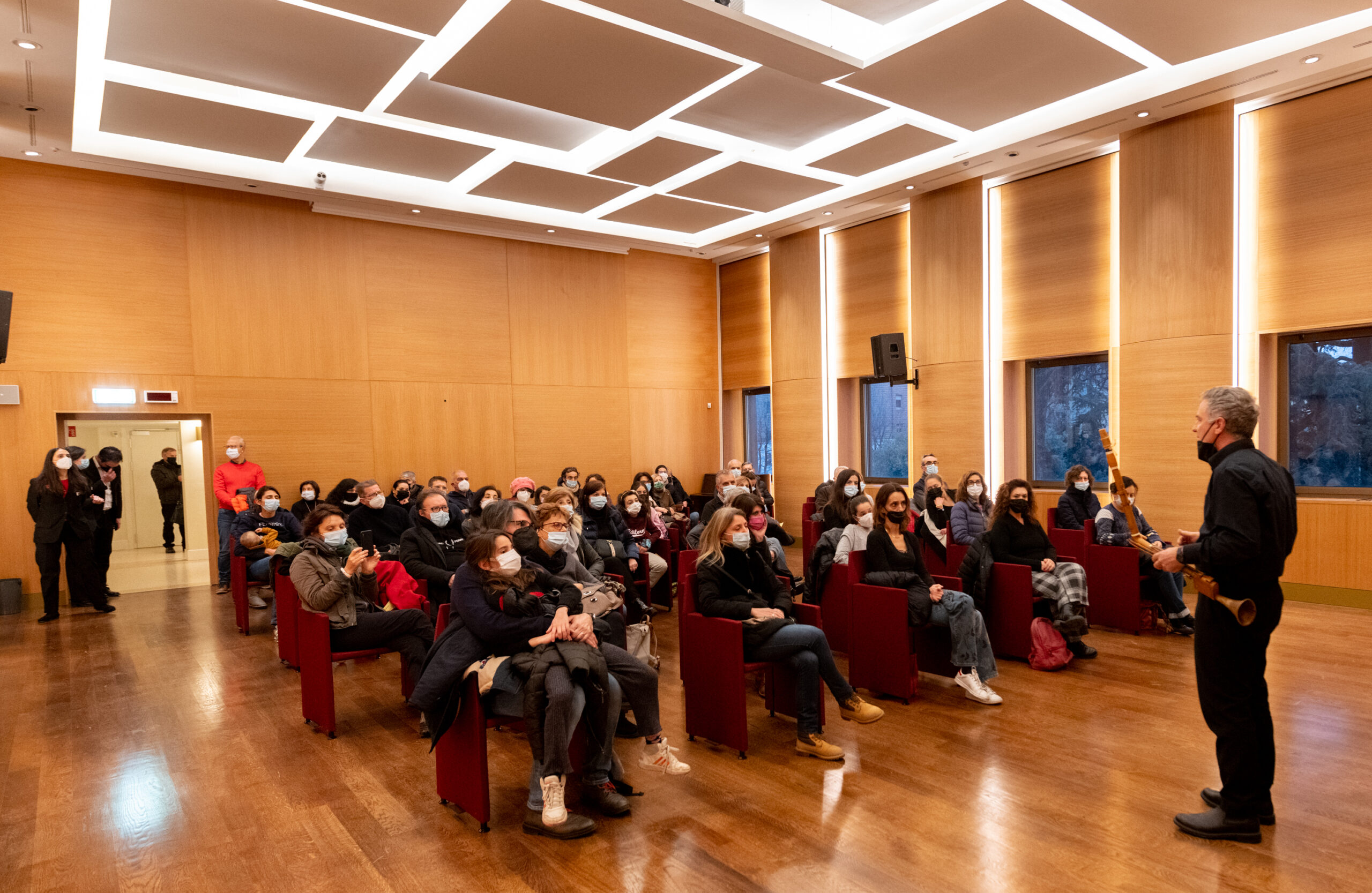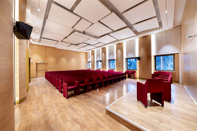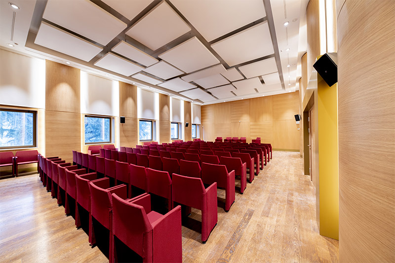 The Tremaglia Music Hall, a former conference room that was completely renovated during the restoration of the Donizetti Theater, is equipped to meet both aesthetic and acoustic quality. The space, lined with wood paneling specially designed to make sound diffusion optimal, boasts the use of innovative technologies that ensure excellent acoustics when the room is both full and partially occupied.