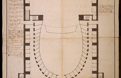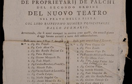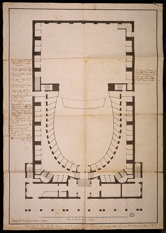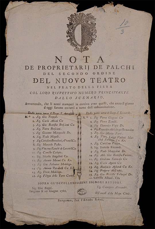 It was on the site where one of these temporary theatres was usually erected that Bortolo Riccardi a member of a lively and enterprising Bergamasque family of merchants, planned to build a permanent theatre in masonry with a wooden roof, even though to do so he had to circumvent the city regulations and those of the Maggiore Hospital, the institution that owned the land on which the Fair was located, which imposed the characteristics of temporariness. With decision and unscrupulousness, Riccardi laid the stone foundations and began to erect the brick pillars. To continue the construction of the theatre, it was necessary to sell the boxes; the purchasers of the time, as in large cities, were members of the great noble families, sometimes of the upper middle class.