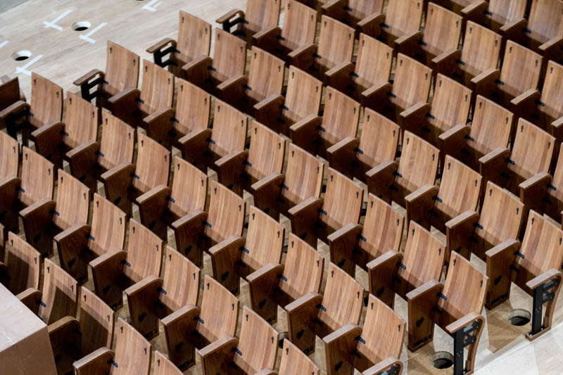 The renovation works involved the entire structure and were mainly aimed at creating rooms for the orchestra in the area below the stalls, the mobile orchestra pit, a new building for the dressing rooms, a new ticket office, as well as new premises for the main bar and the public bar in the gallery. Also new are the west wing with offices, the rehearsal rooms, catering, and audience activity rooms. All the boxes, the ceiling of the stalls and the foyer have been completely renovated.