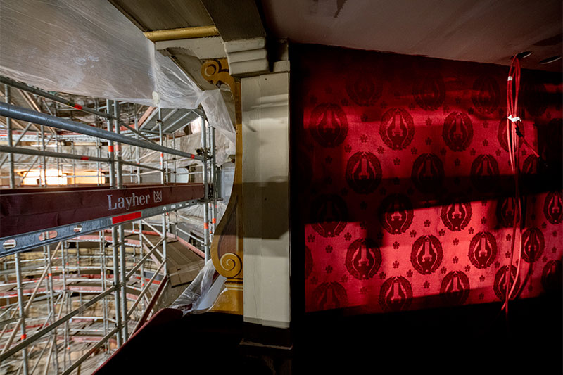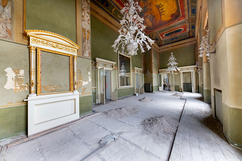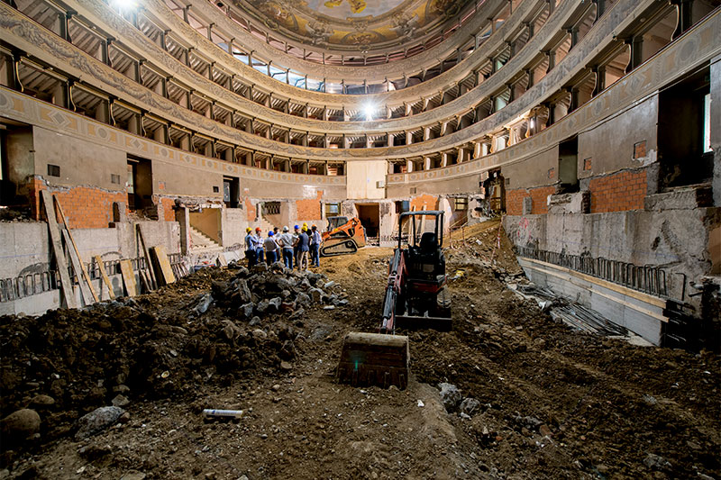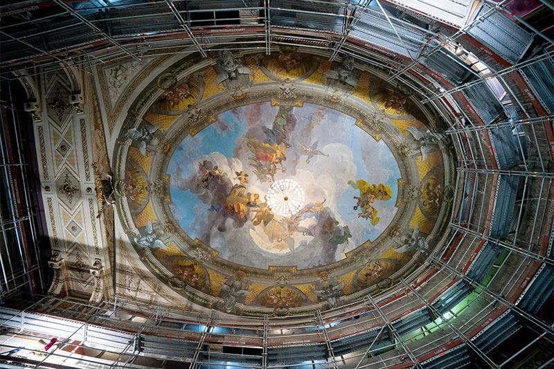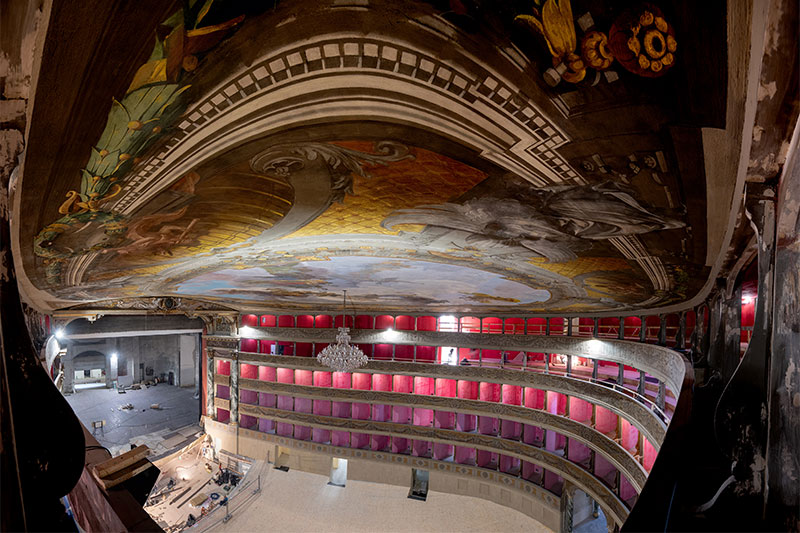 Restoration work on the theater hall and entrance foyer. by means of a thorough survey campaign that allowed the reconstruction of the pictorial stratigraphies of the decorations.