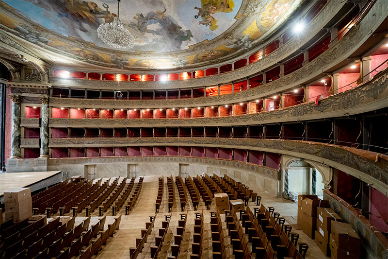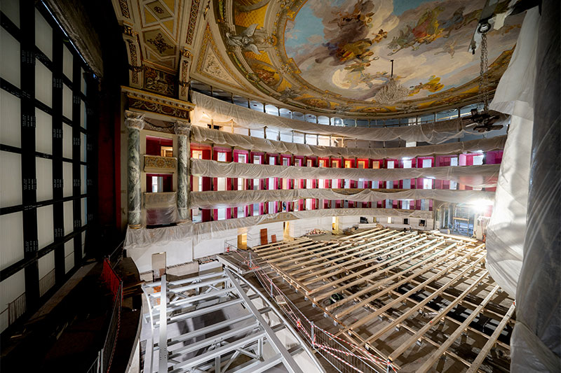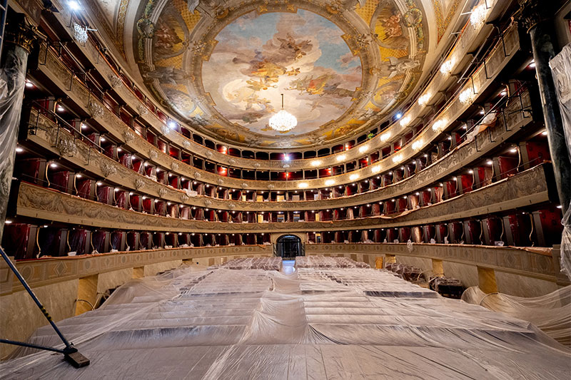 The work involved the entire structure and was mainly aimed at creating rooms for the orchestra in the area under the stalls, the mobile orchestra pit, a new building body for dressing rooms, a new ticket office, as well as ex novo rooms for the main bar and the audience bar in the gallery. Also new are the west body with offices, rehearsal rooms, rooms for catering and audience activities. Completely restored all the boxes, stalls and foyer ceiling.