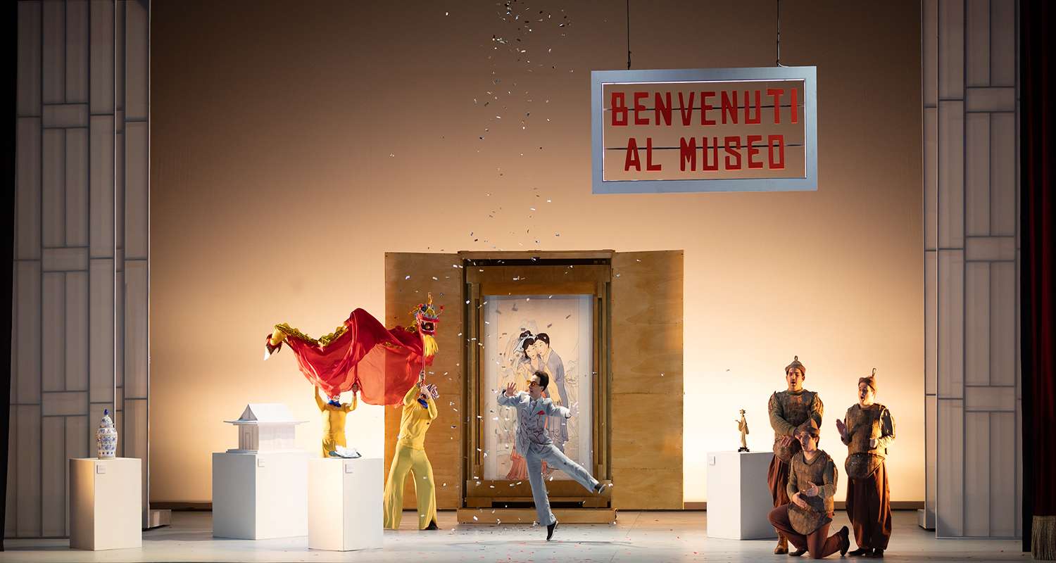 Turandot è una favola che racconta una Cina magica e grandiosa, dove – tra enigmi da risolvere, principi d’oriente, gong del destino, boia e fastosi palazzi imperiali – prende vita la storia della Principessa dal cuore di ghiaccio. Il regista Andrea Bernard sceglie come ambientazione della vicenda, un museo in cui, tra i visitatori, ci sono anche il giovane Calaf, con il padre Timur e con Liù. Il misterioso mondo di Turandot si materializza e riverbera tra statue, ceramiche pregiate, costumi tradizionali e stampe d’epoca. La lettura di un antico manoscritto anima le opere d’arte del museo e i visitatori vengono catapultati tra gli enigmi della Principessa Turandot, che – con l’aiuto di Ping, Pong e Pang, tre statue dell’esercito di terracotta – altro non aspetta che trovare il vero amore ed essere ricordata per sempre.
