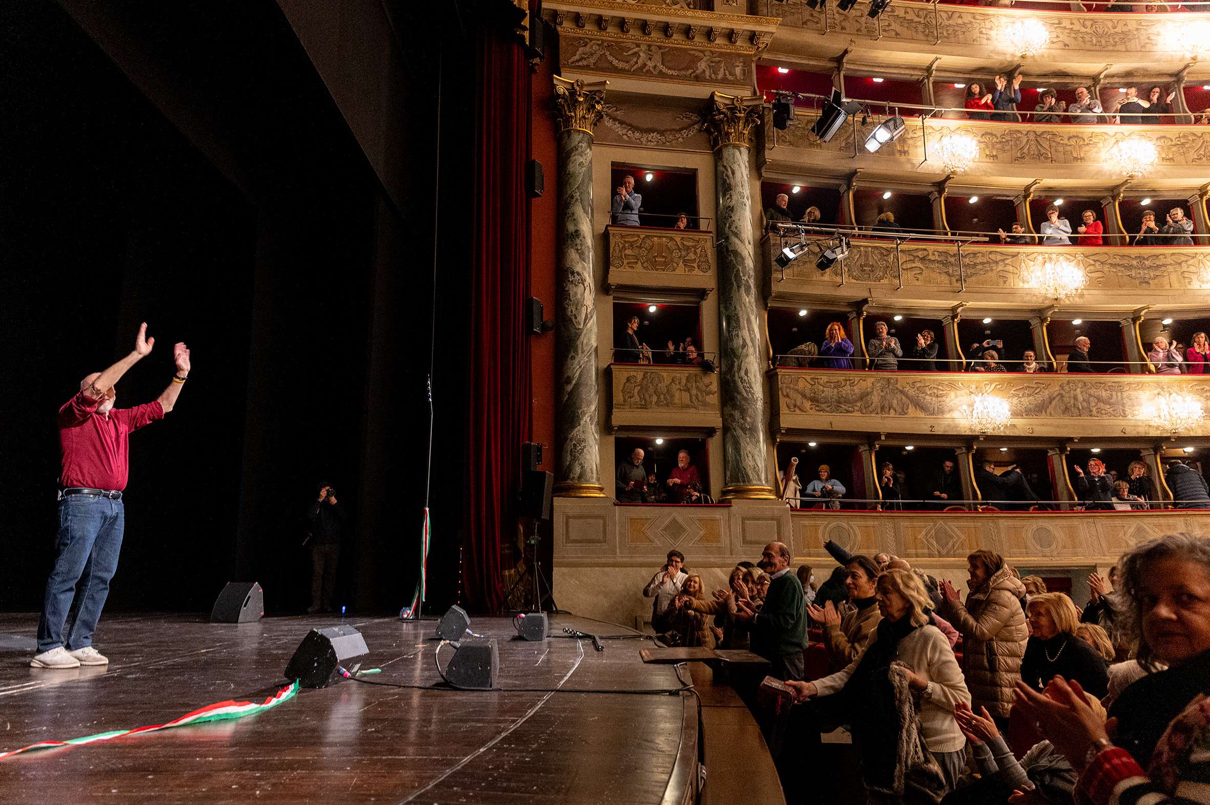 «Il Donizetti è un teatro che ha una crescita esponenziale dei suoi abbonati che chiedono turni di abbonamento in più. E ciò vuol dire che c’è, di fondo, una politica sul territorio fatta bene di cui beneficiamo tutti, anche noi attori», commenta a caldo Marco Paolini, «Il piacere di lavorare per una settimana al Donizetti non è dato solo dal fatto di rappresentare lo spettacolo ma dalla percezione di comunità che c’è intorno al teatro».