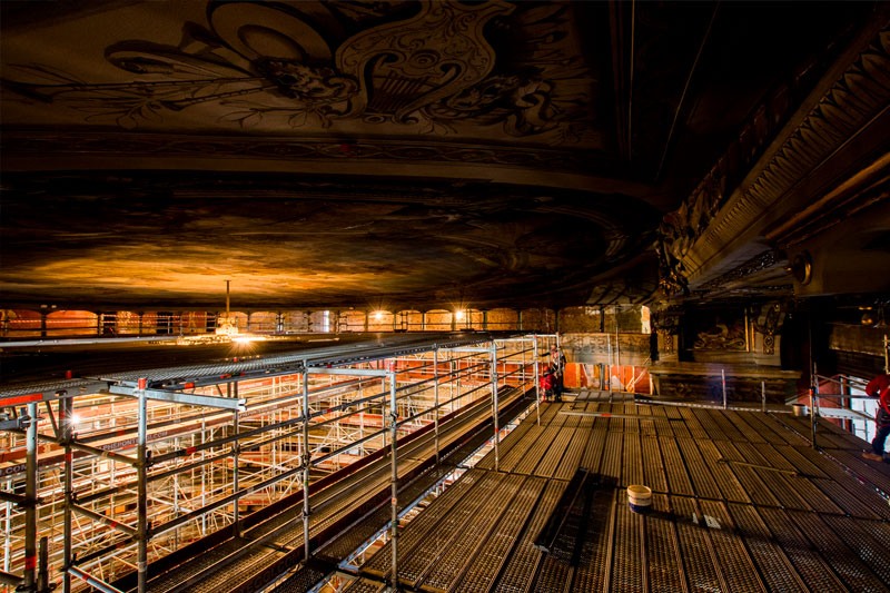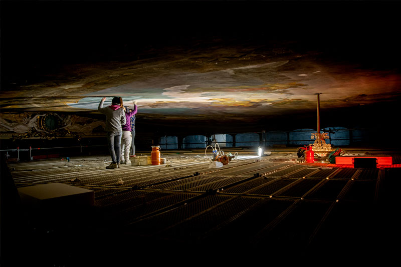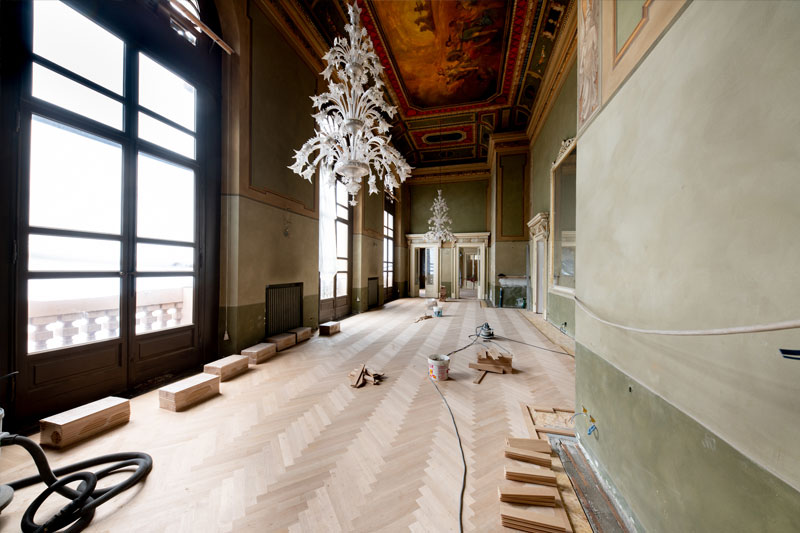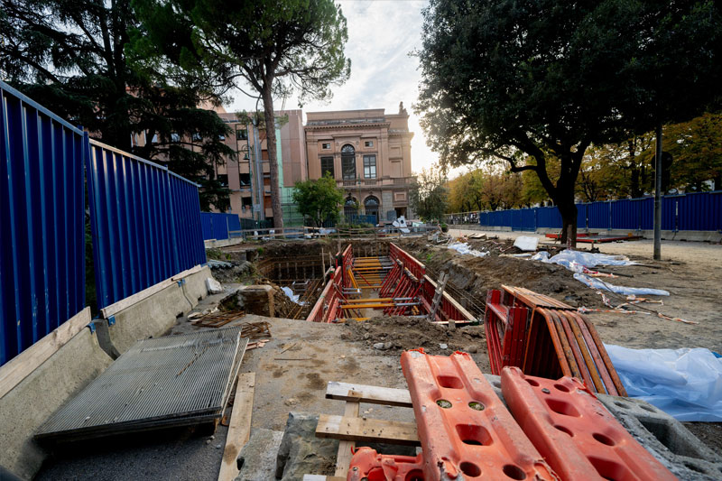 Nel corso delle attività del cantiere è stata necessaria un’ulteriore variazione aggiuntiva al progetto originario. Si sono dovute integrare lavorazioni per modificare l’impronta di scavo della vasca esterna di accumulo dell’impianto automatico di spegnimento incendi a causa del rinvenimento imprevisto di alcuni tracciati infrastrutturali interferenti con lo scavo stesso. Si è dovuto intervenire anche su porzioni di intonaci esistenti che non presentavano una buona adesione al supporto murario. A seguito di alcuni eventi atmosferici caratterizzati da forti piogge e vento, si sono registrate delle importanti infiltrazioni di acqua in corrispondenza dei serramenti dei locali nobili del terzo ordine palchi, in particolare della Sala Riccardi, che hanno bagnato la pavimentazione in parquet e hanno causato infiltrazioni nella soletta, affiorando all’intradosso del soffitto decorato del foyer di piano terra. Pertanto, si è reso necessario un intervento provvisionale urgente di protezione e di restauro dell’apparato decorativo ammalorato.